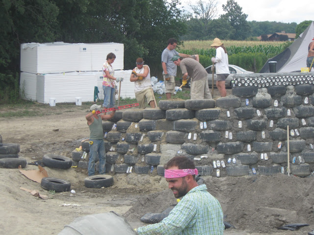 Day 2 with the crew and apprentices was another success. Our town inspector came at 9am (we passed!) and the cement truck came around 10am to dump 14.5 cubic yards into our bond beam form, buttress forms, and the footer. We also did some pack-out with the leftover cement. After lunch (my mom served us baked ziti, caesar salad, watermelon, italian bread and butter, and brownies), a couple groups worked on finishing the tires in our wing walls, while another group chipped away and dug out the rest of our greywater planter cell. The crew and more apprentices started bolting in the wooden forms that will hold the glass between our greenhouse and interior space. And a very exciting part... Mike set up our doorway!